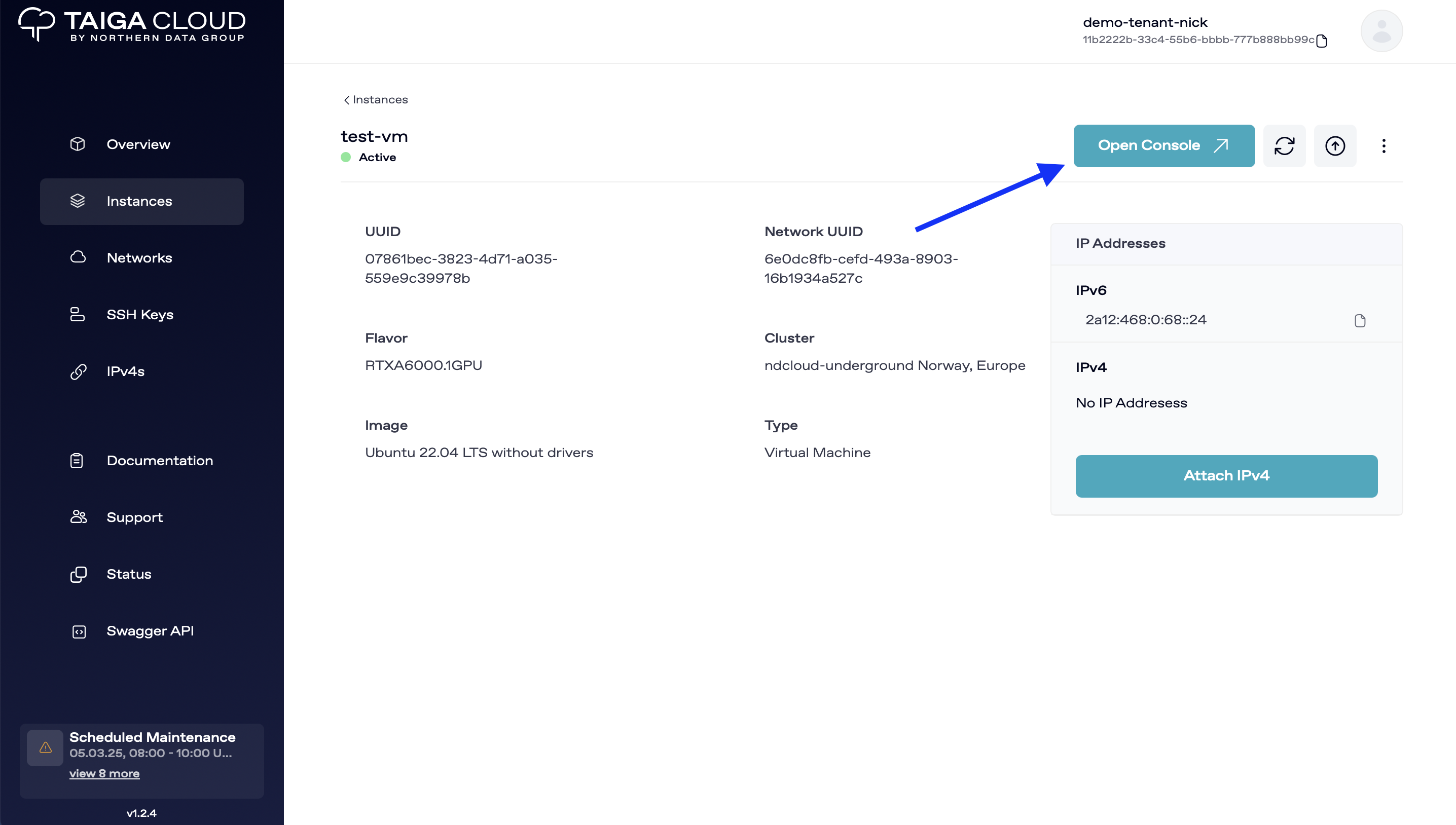 Once the VM is created, all important details can be obtained via the GET /vms/vm/{uuid} API call. The connection can be established via IPv6 or via IPv4 addresses (given that an IPv4 address is attached to the machine):
