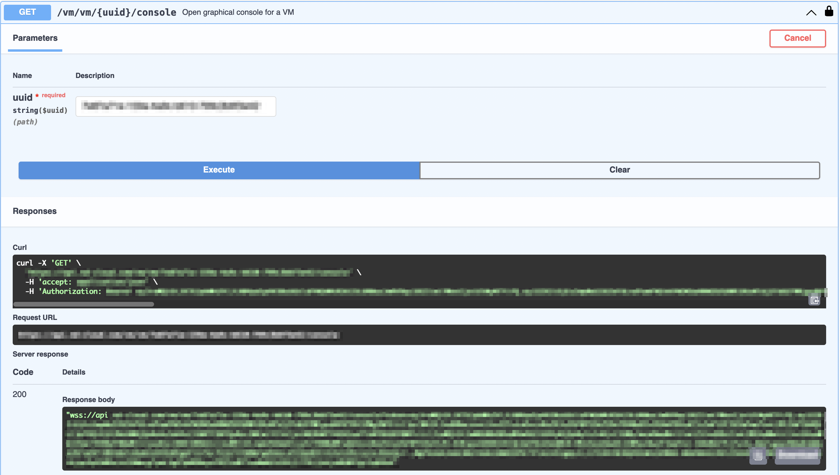 Spice client: Should the usual ssh connection fail, you can still connect to your VM via the spice client console. Authorize against the API, grab the uuid of the VM you want to connect to and run the call GET /vm/vm/{uuid}/console API call.