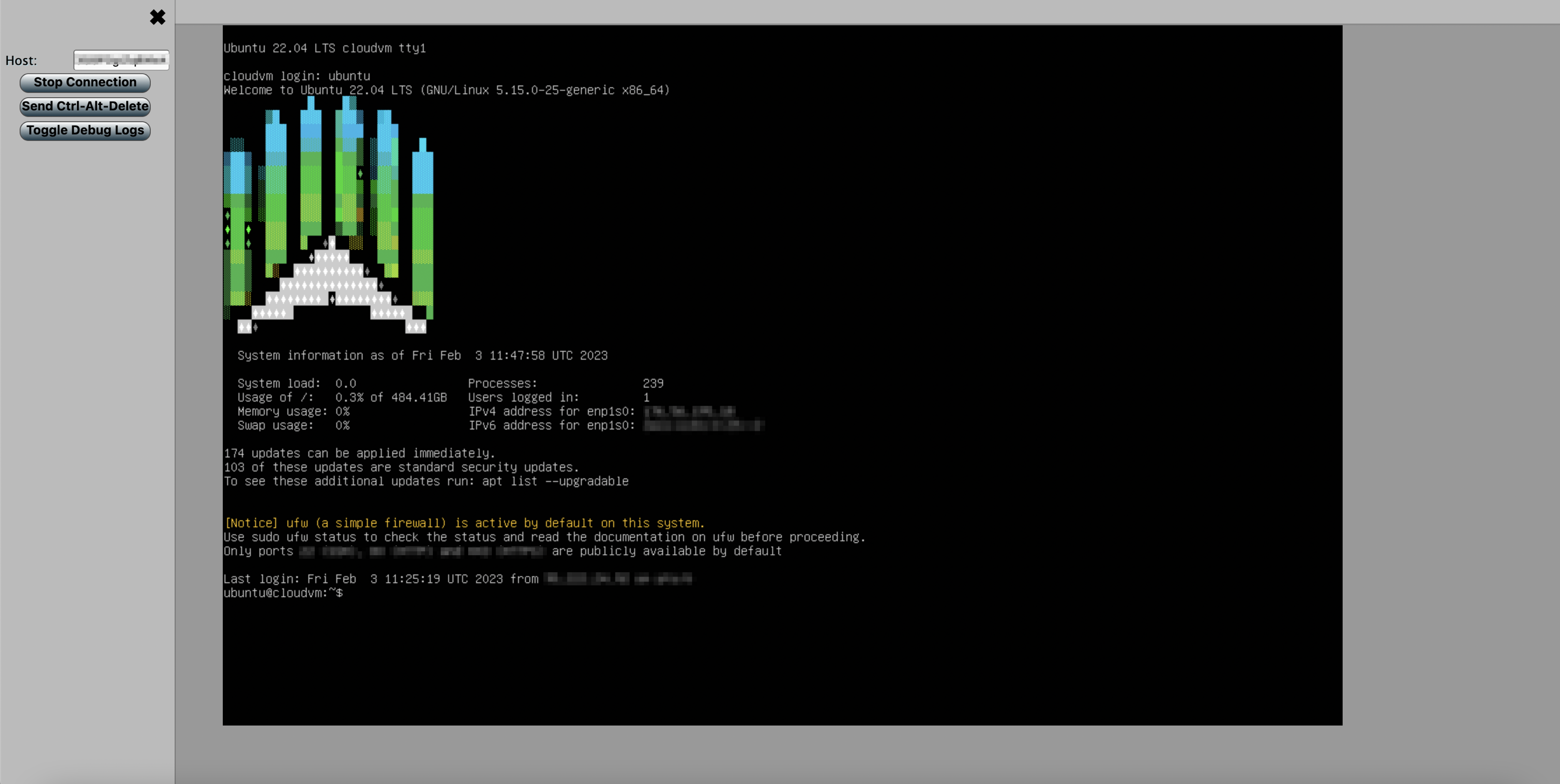 After clicking on Start connection, a terminal window will open where you login can as (default) ubuntu user: