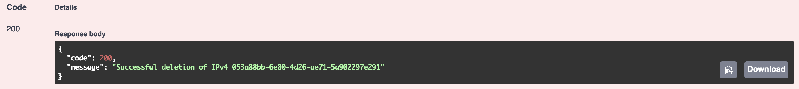 API: Before you remove an IPv4 address, first make sure that it is unbound from a Virtual Machine. If that is the case, simply enter the uuid in the DELETE /network/ipv4/{uuid} API call and click on Execute.
